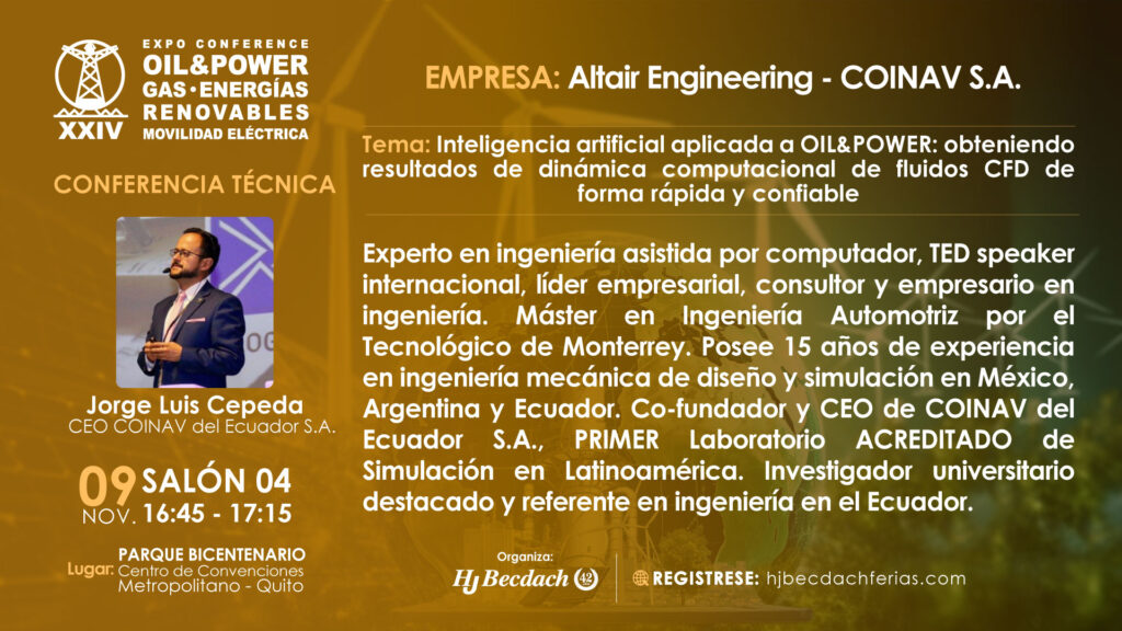 ¡No te pierdas la oportunidad de aprender sobre la aplicación de la inteligencia artificial en el sector de OIL&POWER! Únete a nuestra conferencia magistral presencial “Inteligencia artificial aplicada a OIL&POWER: obteniendo resultados de dinámica computacional de fluidos CFD de forma rápida y confiable” con el destacado ingeniero Jorge Luis Cepeda.
