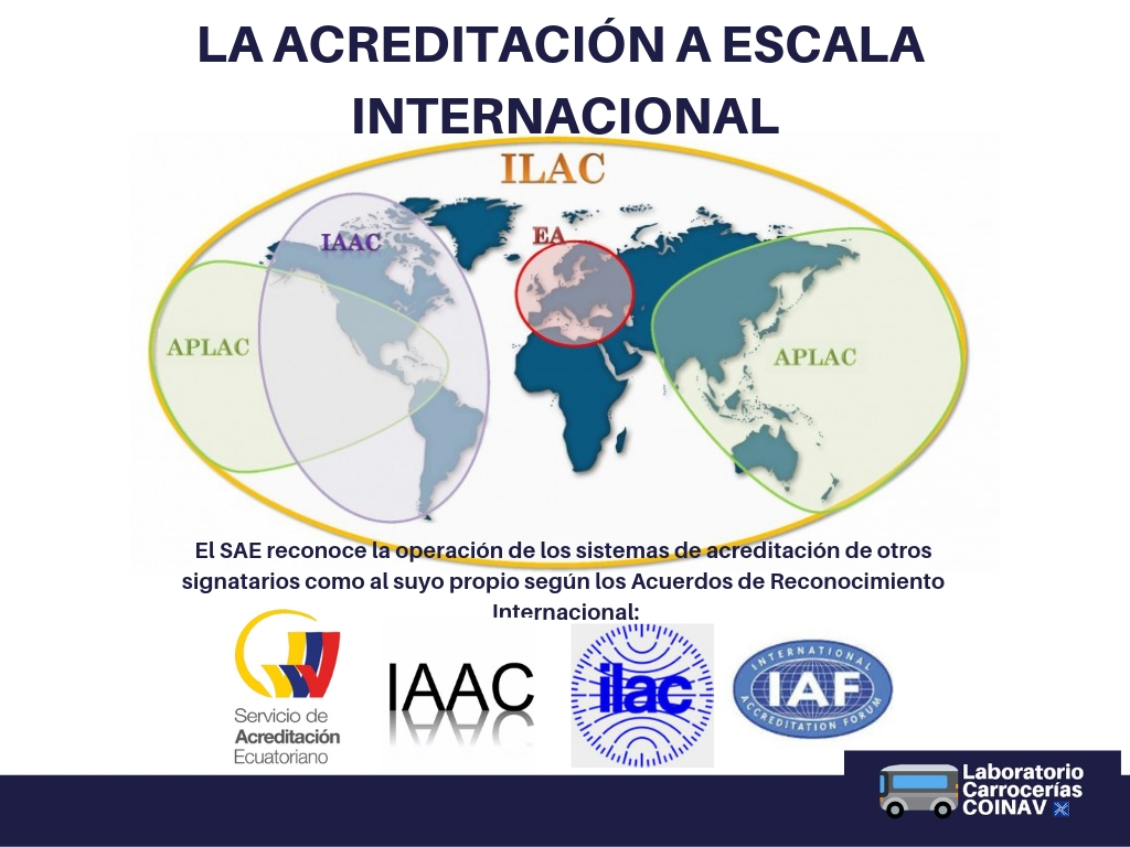 En Ecuador, el organismo oficial de acreditación es el Servicio de Acreditación Ecuatoriano (SAE). Además, a nivel internacional, el SAE es signatario de acuerdos de reconocimiento con organismos internacionales de acreditación como la Cooperación Internacional de Acreditación de Laboratorios (ILAC) y el Foro Internacional de Acreditación (IAF), entre otros.
